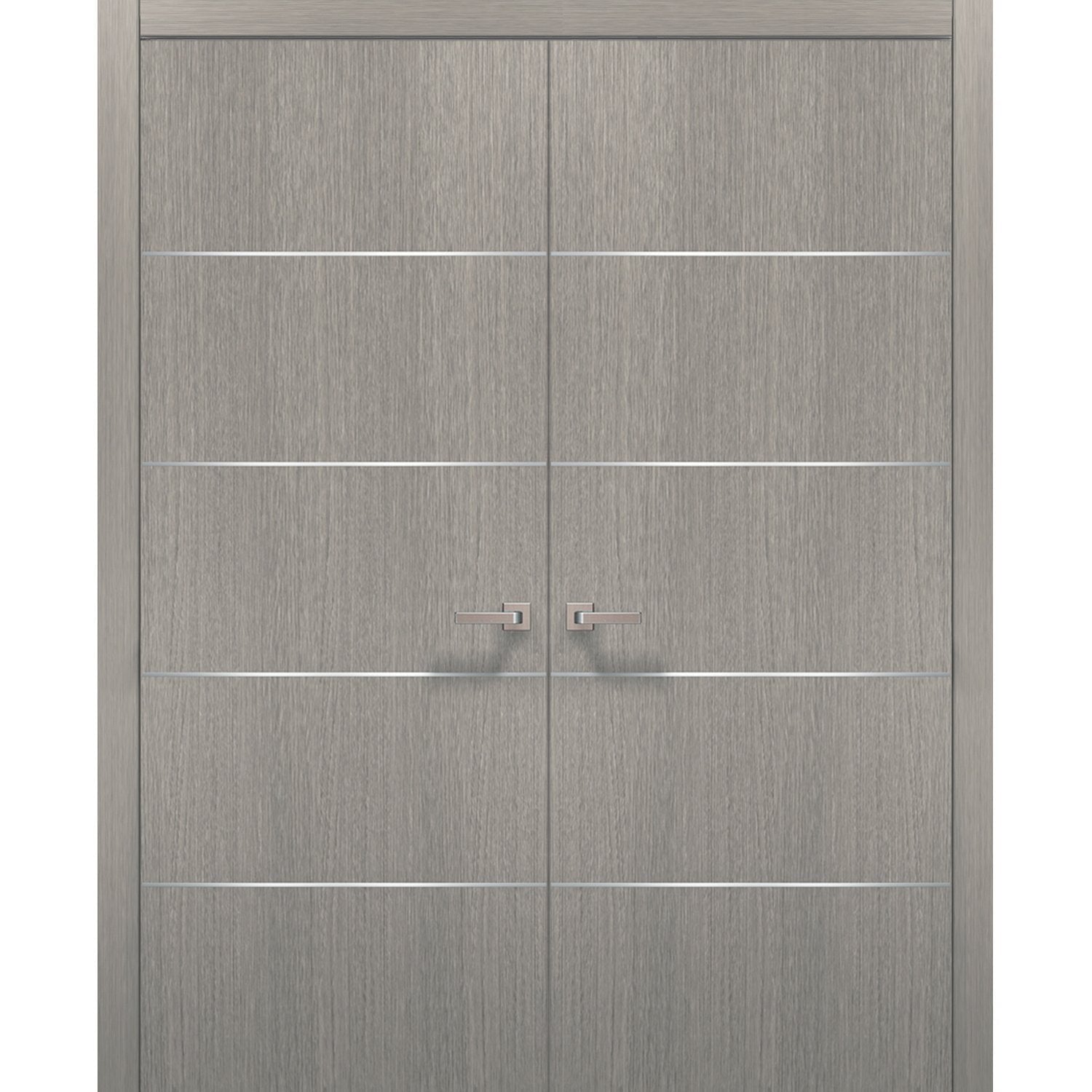 SartoDoors - the european doors of modern minimal design. Best choice for bedroom, bathroom or closet - warm look and bright colors, high quality materials and soft opening. Finish - eco-veneer RENOLIT (Germany). Door made of solid pine wood with honeycomb. Thickness of the door - 1 3/5". 1/3" wide aluminum molding strips are inserted flush with the plane of the slab. Doors are not pre-cut for the hardware. Assembly of frames and trims required. Doors work with all swing directions. Rough opening can be calculated: “door width” + 2 1/2”; “door height” + 2”. Set includes: - 2 doors slabs; - trims (2.95” wide); - frames (for wall thickness from 4” to 5 1/2”); - 2 passage lever/knob; - non-mortise hinges; NO FORMALDEHYDE Environmentally friendly using only latest eco-friendly materials. Company requirements the safest materials. We take care about your family. Sarto Doors are recommended for Applying in hospitals, childcare centers and networks catering. SEALING GUM GERMAN COMPANY DEVENTER It has a special profile that allows to protect your home from dust, makes a cozy and quiet atmosphere around every day. On another side it allows you to save 35 % more heat and save up to 20% to the bill. SOUND ATTENUATION Door's 1 3/5” thick solid wood construction yields 30% noise reduction over standard doors. CONSTRUCTION Door is manufactured from a single piece of wood and will give several generations of normal usage with minimal care. Door with frame, hung door, european door with molding, bedroom door.